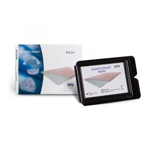 Quartz splint MESH has been especially designed for reinforcing acrylic resin dentures. Quartz splint is pre-impregnated with a proprietary methacrylic resin matrix which can chemically bond to the majority of composite. The industrial impregnation and the know how of RTD in fibre technology prevent from having bubbles and voids within the material. The special mesh allows a perfect integration within the acrylic resin with a high aesthetic effect and a tremendous reinforcement. It also gives an easy adaptation to the oral curves. It can be custom-formed easily before curing. Quartz splint MESH can be used routinely for denture reinforcement and for denture repair. Quartz splint MESH very advantageously replaces the standard metal framework, which is subject to corrosion and show-through. The modulus of elasticity of Quartz splint MESH is close to acrylic resin and this prevents de-lamination and micro-leakage and offers long lasting results.