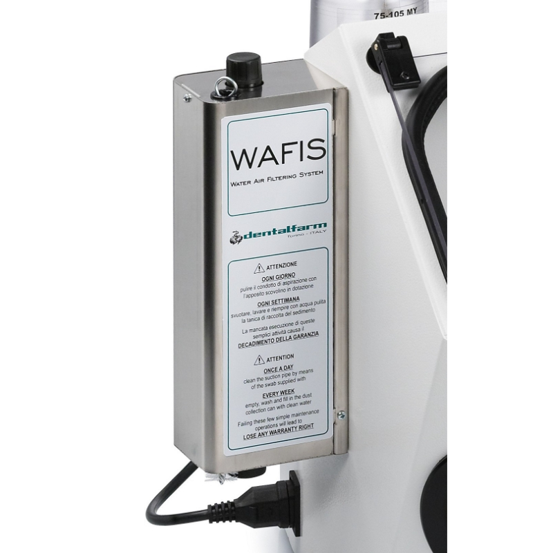 Dentalfarm WAFIS Add-on W.A.FI.S. is a dust suction and filtering system : The Water Air Filtering System is an exclusive DENTALFARM patent that, thanks to the combined action of water and air pressure, eliminates up to 99.8% of the dust particles originated during the sandblasting process solving the problems connected to the toxis dust originated during any sandblasting process. This compact unit has been expressly designed to be fitted on the left side of DENTALFARM blasting equipment. Power supply is connected to the sandblaster and it starts automatically the moment the light switch is operated. The water is contained in the same tank where the blasting residues are collected. The elimination of sludge accumulated at the bottom and water level restoration is only needed on a monthly basis. Precautions MAINTENANCE INSTRUCTIONS The system is not built up by any parts subject to wear which require regular replacement such as filters or filtering bags or electric motor susceptible to be damaged by the fine abrasive powder. The only maintenance operations for the WAFIS System consist in a steady cleaning and the assurance that air can flow out freely, without any obstruction. ONCE A DAY, remove the inspection cap (F) and introduce the cleaning swab (G) inside EVERY WEEK in case of huge work or alternatively EVERY 15 DAYS, remove the connections from the can, empty it, clean it carefully and pour in fresh water. Technical Features • Overall dimensions L x D x H 100 mm x 100 mm x 270mm • Net and gross weight 2.3 kg – 3.0 kg • Min working pressure 3 BAR • Max working pressure 6 BAR • Air consumption 50 l/min at 3 BAR – 70 l/min at 5 BAR • Percentage of dust filtration 99.8% • Voltage 220-230 v AC 50Hz