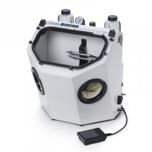 DentalFarm Sandblaster Base 3 ALL-IN-ONE BLASTING CENTERS Complete ALL-IN-ONE blasting center BASE 3 is a sandblasting unit designed for devesting and finishing. Fitted with a powerful devesting recycle projector, a tank for aggressive corundum for the removal of investments, and two disposable microblasting modules for aluminum oxide powder or glass-microbeads. The standard configuration is a ready to use unit, best-suited to meet your basic needs and it is fitted with the new LED white lighting system. DENTALFARM has developed the so-called W.A.FI.S. (WATER AIR FILTERING SYSTEM), a patented solution which eliminates airborne dust thanks to the combined action of water and air pressure, in compliance with hygiene and safety regulations. The WAFIS system can be easily connected on the top left side of the machine and starts automatically when the sandblaster switches on. DENTALFARM ranges also include PRO-3 and PRO-3 Shake suction units, which can be easily connected to any sandblasting machine. Features The main features of the machine are: the ergonomic layout of the working chamber, the safety of use, and the trouble-free structure of the mechanical installation. BASE 3 is equipped with useful accessories and ensures a fast, practical and accurate work. The unit consists of a devesting projector and of 2 EASY tanks, featuring a pressure discharge system and an instant stop of the blasting jet. The unit can thus operate with three different abrasive media. Precautions The sandblasting process originates toxic dust which must not be inhaled; for this reason, it is absolutely forbidden to operate the machine if a proper suction system has not been previously connected to the sandblaster. Technical Features • Recirculation blasting system: YES (devesting projector with Ø3.0mm nozzle) • Microblasting tanks: two • Heating system: NOT available • Available nozzles (finishing): 0.8mm for grainsize 75 to 95µm; 1.2mm from 95 to 110µm; 0.5mm for 50µm; 2.0mm for 250µm. • Optional connection to an electric extractor or to the WAFIS system • Overall dimensions: 415x400x415mm • Working pressure: 2.5 – 6.0 BAR (devesting) – 1.5 – 5.0 BAR (microblasting)