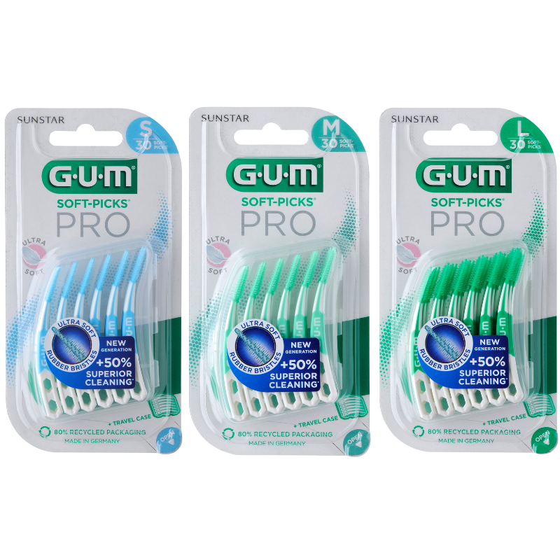 New GUM Soft-Picks PRO are an evolution in interproximal care, combining the convenience of a toothpick with the efficacy of an interdental brush, giving you a 50% superior clean in-between the teeth.