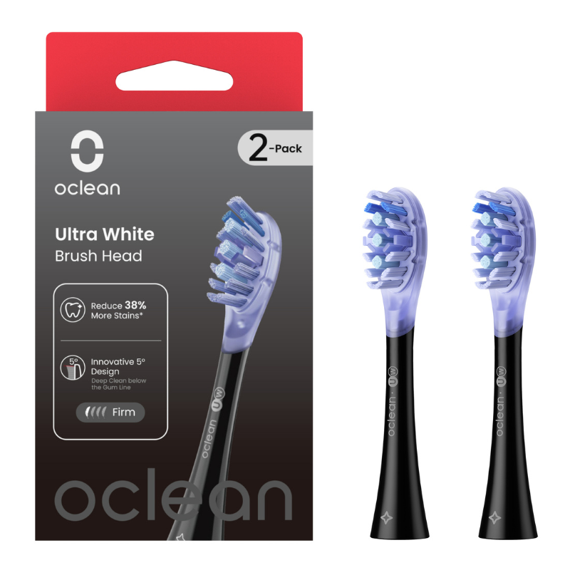 Oclean Ultra White Replacement Head (black, 2 heads per pack) With innovative, patented FlexFit™ technology, Oclean Ultra White flexible heads provide enhanced reach and reduced pressure, ensuring optimal protection for teeth and gums. Compatible with all Oclean sonic brushes. • Specifically designed to combat extrinsic surface stains • Angled design for effective cleaning between teeth and below the gumline • FlexFit flexible brush head offers a wider swing angle, enhancing cleaning while reducing pressure on teeth and gums • Rubber polishing ring helps to remove surface stains