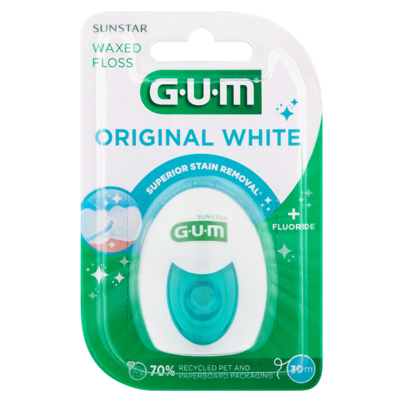 GUM Original White Floss is a quality, waxed floss with micronized silica to help remove surface stains between teeth, where your toothbrush cannot reach. For a naturally brighter smile and to prevent new stains from forming use in conjunction with GUM Original White toothpaste and mouthrinse.
